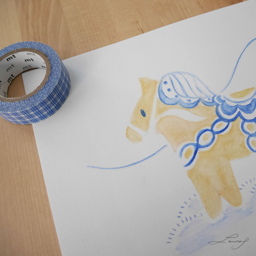 Una es una pequeña acuarela con el caballito Dala de protagonista. Creo que con un marco quedaría preciosa en cualquier rincón.
